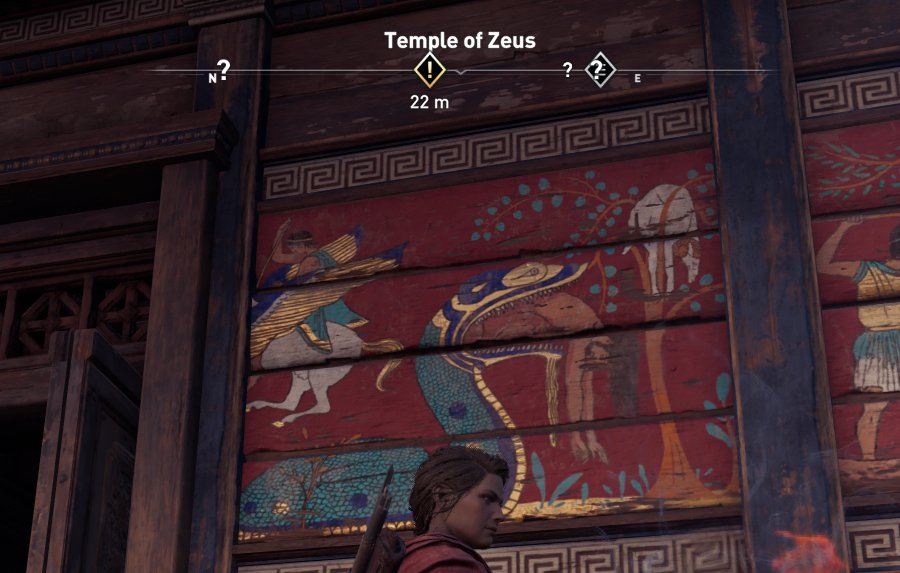 First up in #ArtofACOdyssey, we have this lovely painting on the Temple of Zeus in Sami. We’ll leave aside Bellerophon with his tricked-out Pegasus for now and focus on the central figure. If you recognize it, good job! The original is on an Attic kylix (480-470BCE) attributed to Douris, an Attic painter who worked during the early 5th c. BCE.