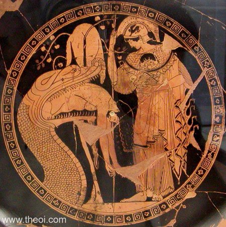 This is one of my favorite pieces. It shows an alternate version of the Argonautica, wherein Jason gets devoured by the Colchian dragon and has to be saved by Athena. I like to think of her as saying something like “It’s a good thing you’re cute, Jason.”